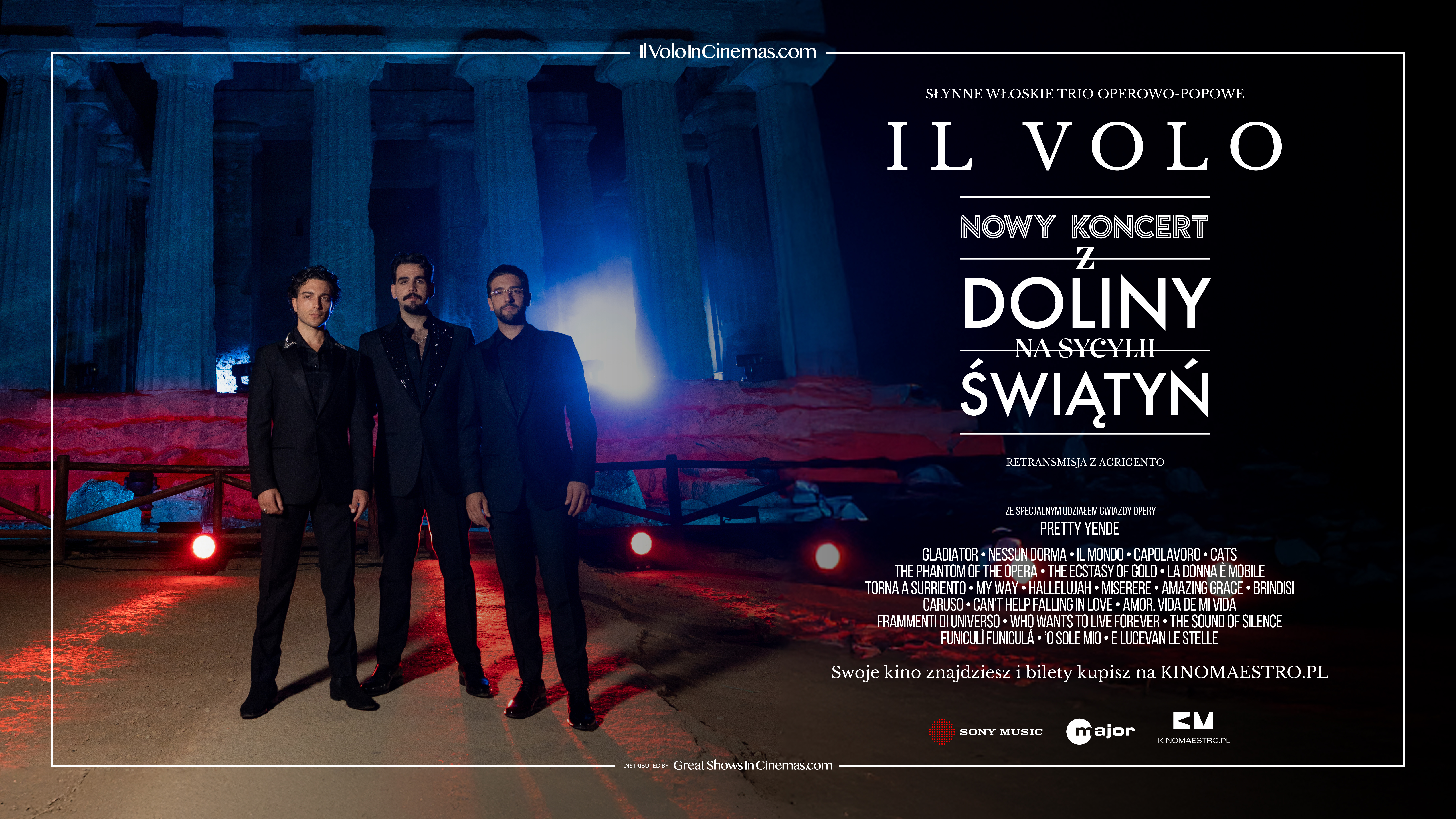 Ten niezwykły koncert odbył się w wyjątkowym miejscu na południu Włoch. Latem 2024 roku artyści wystąpili w Valle dei Templi (Dolina Świątyń), wpisanym na Listę Światowego Dziedzictwa UNESCO monumentalnym zespole architektury helleńskiej na Sycylii. Ich występ podbił serca słuchaczy. Jego kinowa retransmisja jest więc niepowtarzalną okazją, by usłyszeć największe przeboje w wykonaniu tych trzech wyjątkowych śpiewaków: Piera Barone, Ignazia Boschetto i Gianluki Ginoble.